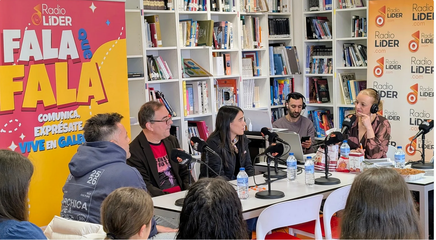 O alumnado de 3º e 4º da ESO asistiu na biblioteca escolar ó programa de Radio Líder “Fala que Fala”, un programa que está apoiado polos Equipos de Dinamización Galega da Xunta de Galicia e que ten como principal obxectivo o fomento do noso idioma nos centros educativos e que incita ao alumnado a comunicarse, expresarse e vivir en galego.